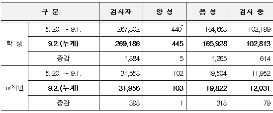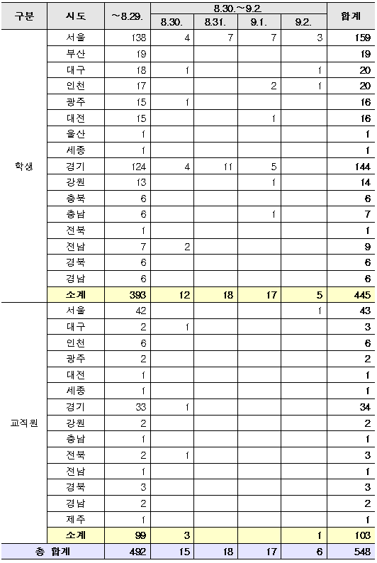 - 등교 이후 확진자 누계 9.2.(수) 00시 대비 학생 8명, 교직원 1명 증가 【누계 548명(학생 445명, 교직원 103명)】