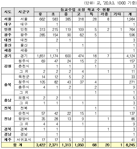 ◈ 등교수업일 조정 현황[9.3.(목) 10:00 기준]