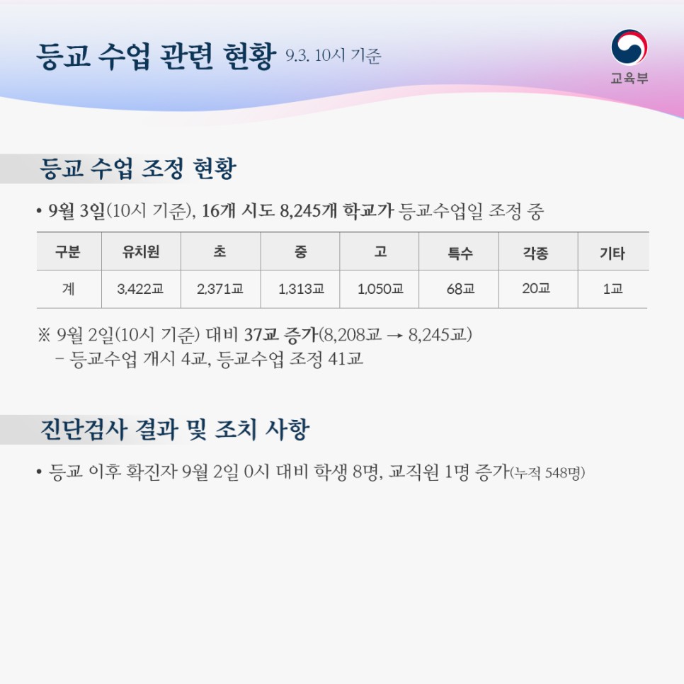 - 9월 2일 0시 대비 학생 8명 증가, 교직원 1명 증가 (누적 548명)