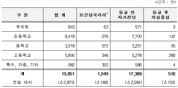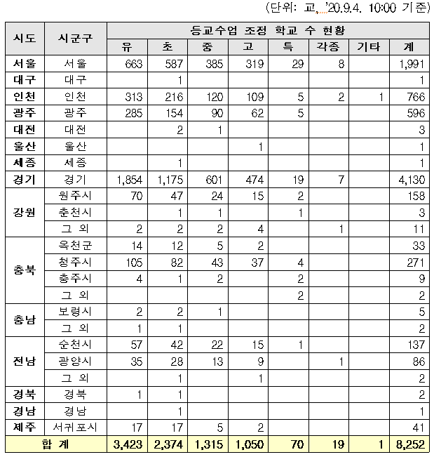 - 9.3.(10시 기준) 8,245교에서 7교 증가(11교 등교수업 개시, 18교 등교수업 조정)