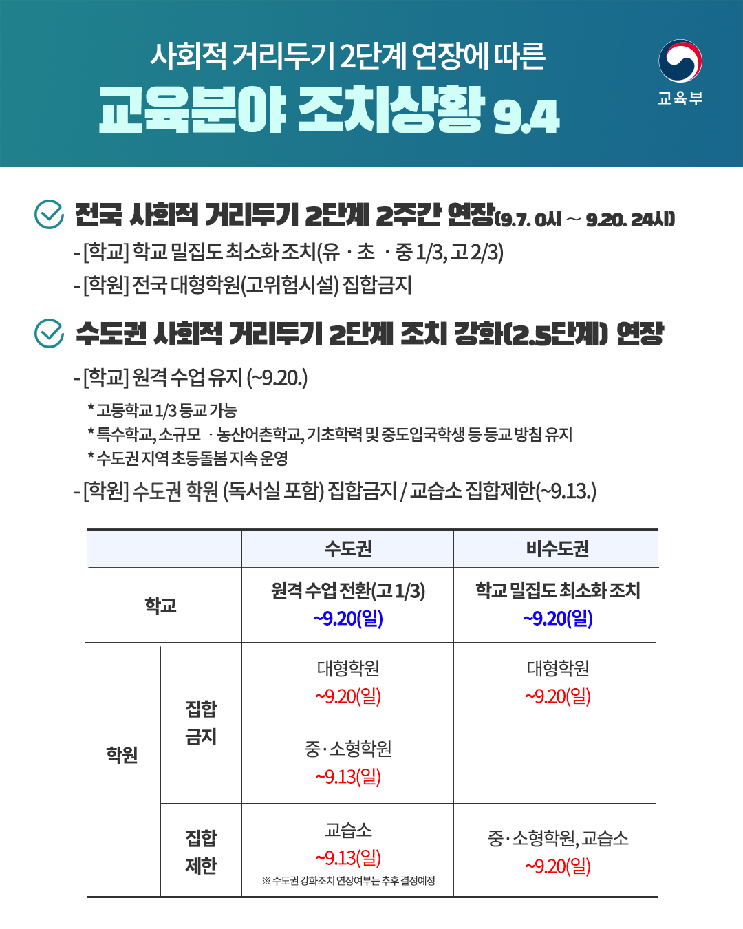 [사회적 거리두기 2단계 연장, 교육분야 조치상황] 본문