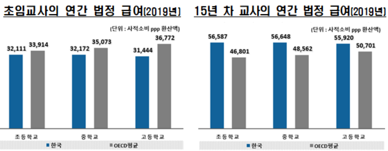 2019년 우리나라 국공립학교 초임 교사의 법정 급여는 OECD 평균보다 적었으나, 15년 차 교사의 법정 급여는 OECD 평균보다 많았다.