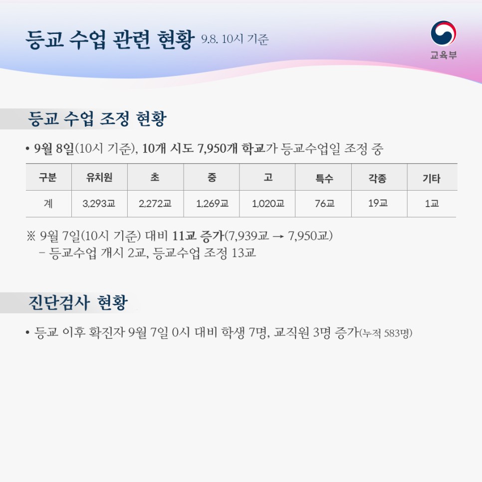 - 9월 7일 0시 대비 학생 7명 증가, 교직원 3명 증가 (누적 583명)