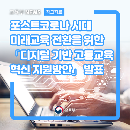 교육부(부총리 겸 교육부장관 유은혜)는 9월 9일(수)에 열린 제15차 포용국가 실현을 위한 사회관계장관회의에서포스트코로나 시대 미래교육 전환을 위한 「디지털 기반 고등교육 혁신 지원방안」을 발표했다. 이번 방안은, 지난 7월 2일(목)에 개최된 ‘포스트 코로나 교육 대전환을 위한 총장과의 대화’에서 논의된 방안을 기반으로, 대학생, 교원 등 현장의 목소리를 최종 반영하여 확정한 것이다.