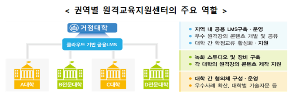 대학간 자원 공유 활성화, 고속 전산망 구축 지원 및 우수 온라인 콘텐츠 확충‧보급을 통해 대학 간 원격수업 격차 완화를 추진한다. 전국 10개 권역별로 거점대학을권역별 원격교육지원센터로 지정하여 공용 LMS 및 원격강의 장비를 구축하도록 지원하고(’20,128억원 → ’21,179억원) 지역 내 대학간 실험실습실 및 취‧창업지원공간 공유 등 온-오프라인 협업도 지원한다