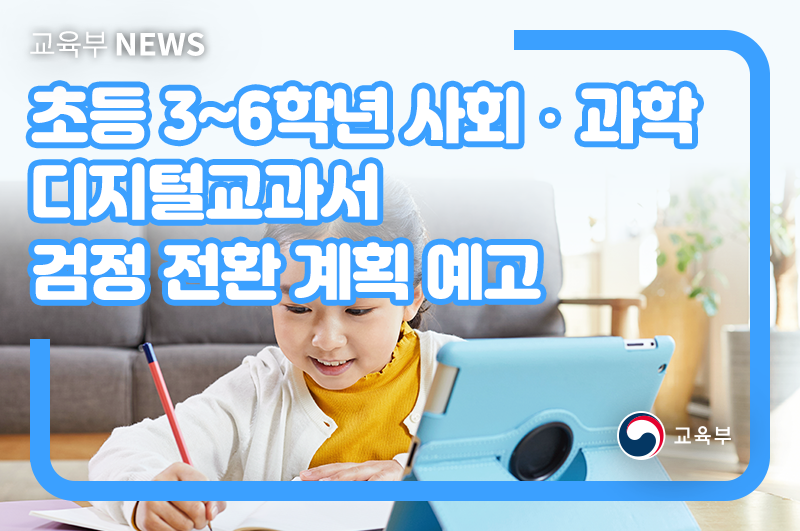 교육부(부총리 겸 교육부장관 유은혜)는 9월 11일(금)「2015 개정 교육과정에 따른 초・중등학교 디지털교과서 국・검정 구분」(교육부 훈령)일부 수정 고시안을 행정예고했다. 현행 국정인 초등 3~6학년 사회・과학 디지털교과서를 검정으로 전환하여 발행하는 것을 주요 내용으로 한다.