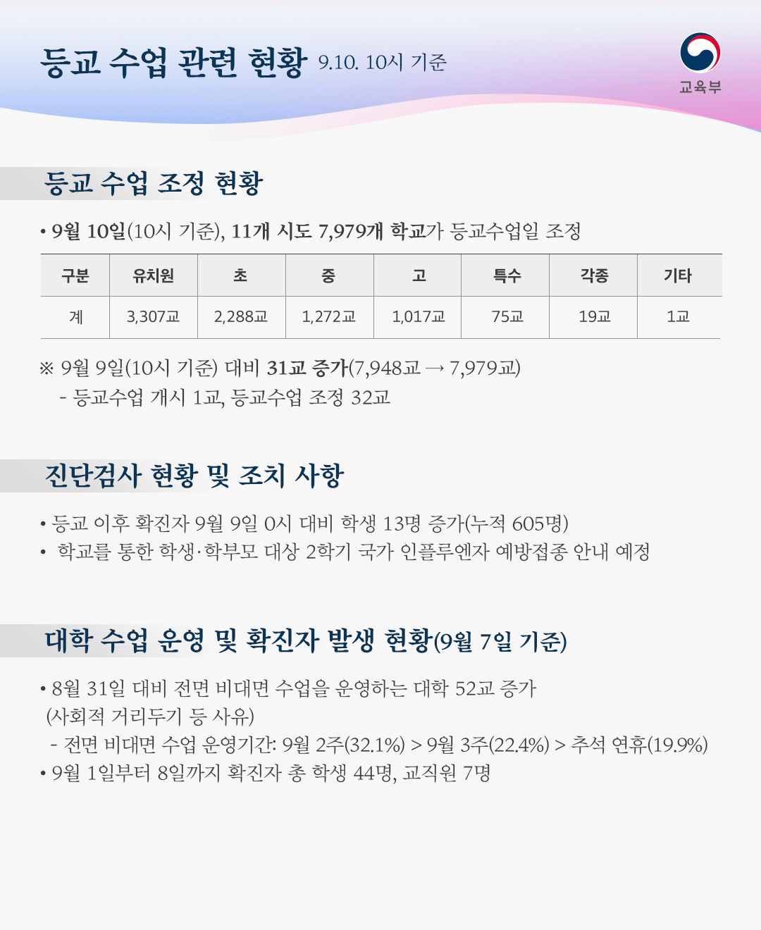 - 9월 1일부터 8일까지 확진자 총 학생 44명, 교직원 7명