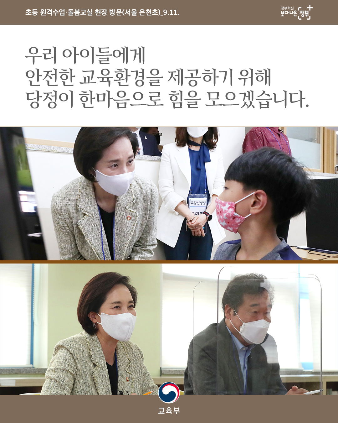 유은혜 부총리 겸 교육부장관, 더불어민주당 이낙연 대표, 유기홍 국회 교육위원장 등은 코로나19 여파로 등교 대신 원격수업이 진행되는 교육현장을 방문하여 맞벌이 가정 등을 위해 실시되는 긴급돌봄 현장을 점검하고, 학생들의 원격수업을 참관하였습니다.