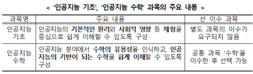 ◈ 고등학교 ‘인공지능 기초’, ‘인공지능 수학’ 과목 신설, 내년 2학기부터 선택 가능