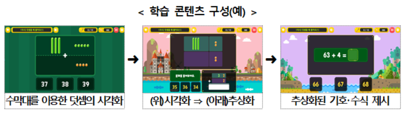 ㅇ 특히 학습 콘텐츠는 수학적 개념과 원리를 쉽게 이해할 수 있도록 시각화된 그림에서 추상화된 기호・수식순서로 단계적으로 제시하였다.