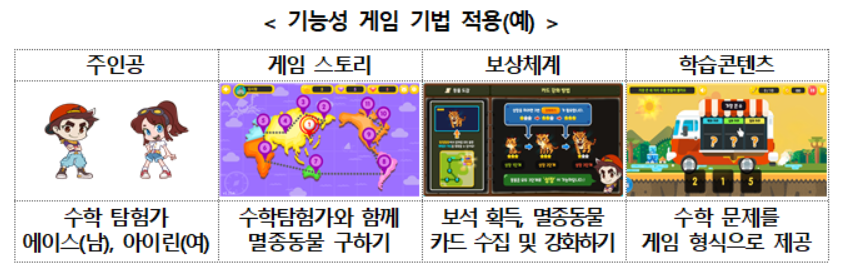 ㅇ ‘수학탐험대’의 콘텐츠는 초등학교 저학년의 발달 특성을 고려하여, 기능성 게임*기법(gamification)을 적용함으로써 학생들이 수학을 즐겁게 배울 수 있도록 하였다.