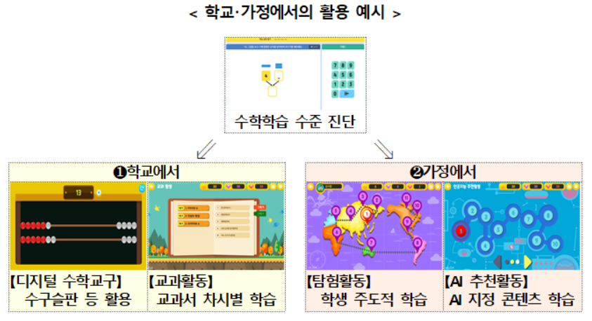 ㅇ 초등학교 저학년(1, 2학년)이학교에서는 수준별 개별화 학습, 가정에서는 자기 주도적 학습을 함께 할 수 있도록 인공지능(AI)을 활용한 「똑똑! 수학탐험대」서비스를 9월 14일(월)부터 전국 모든 초등학교에 제공한다.