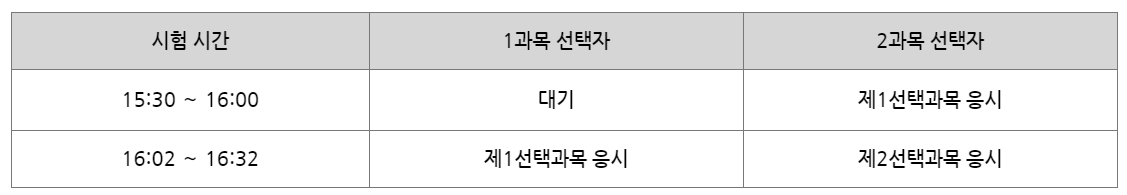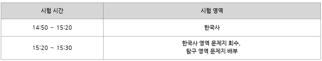- 한국사 영역 시험 시간 종료 후 한국사 영역 문제지 회수 및 탐구 영역 문제지 배부 시간을 10분 부여한다(탐구 영역 미선택자는 대기실로 이동 가능).