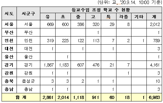 ㅇ 9.14.(10시 기준) 9개 시·도 6,983개 학교가 등교 수업일 조정 중