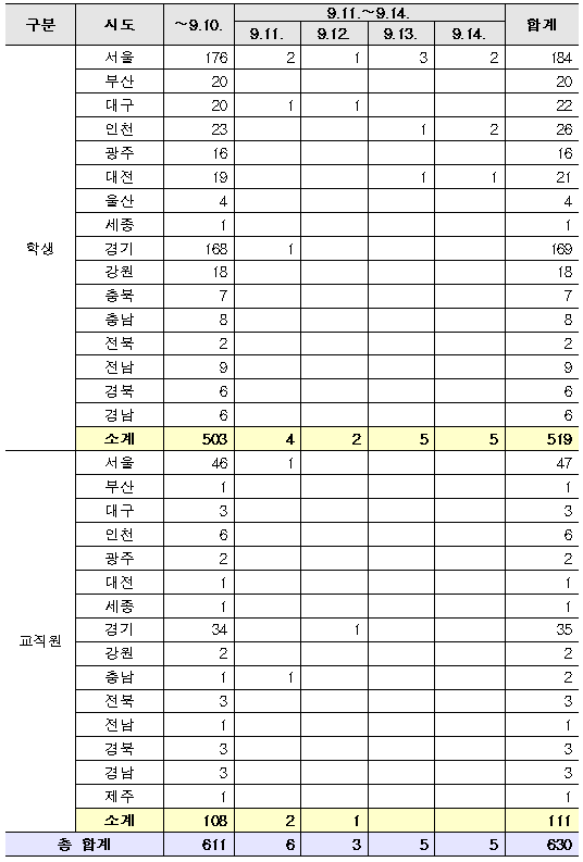 - 등교 이후 확진자 누계 9.14.(월) 00시 대비 학생 9명 증가 【누계 630명(학생 519명, 교직원 111명)】