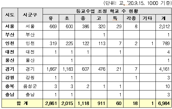 - 9.14.(10시 기준) 6,983교에서 1교 증가(1교 등교수업 조정)