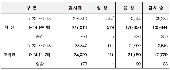 * (학생) 9.11. 확진 1명, 9.12. 확진 1명, 9.13. 확진 2명 추가 반영 (학생 510명 → 514명)