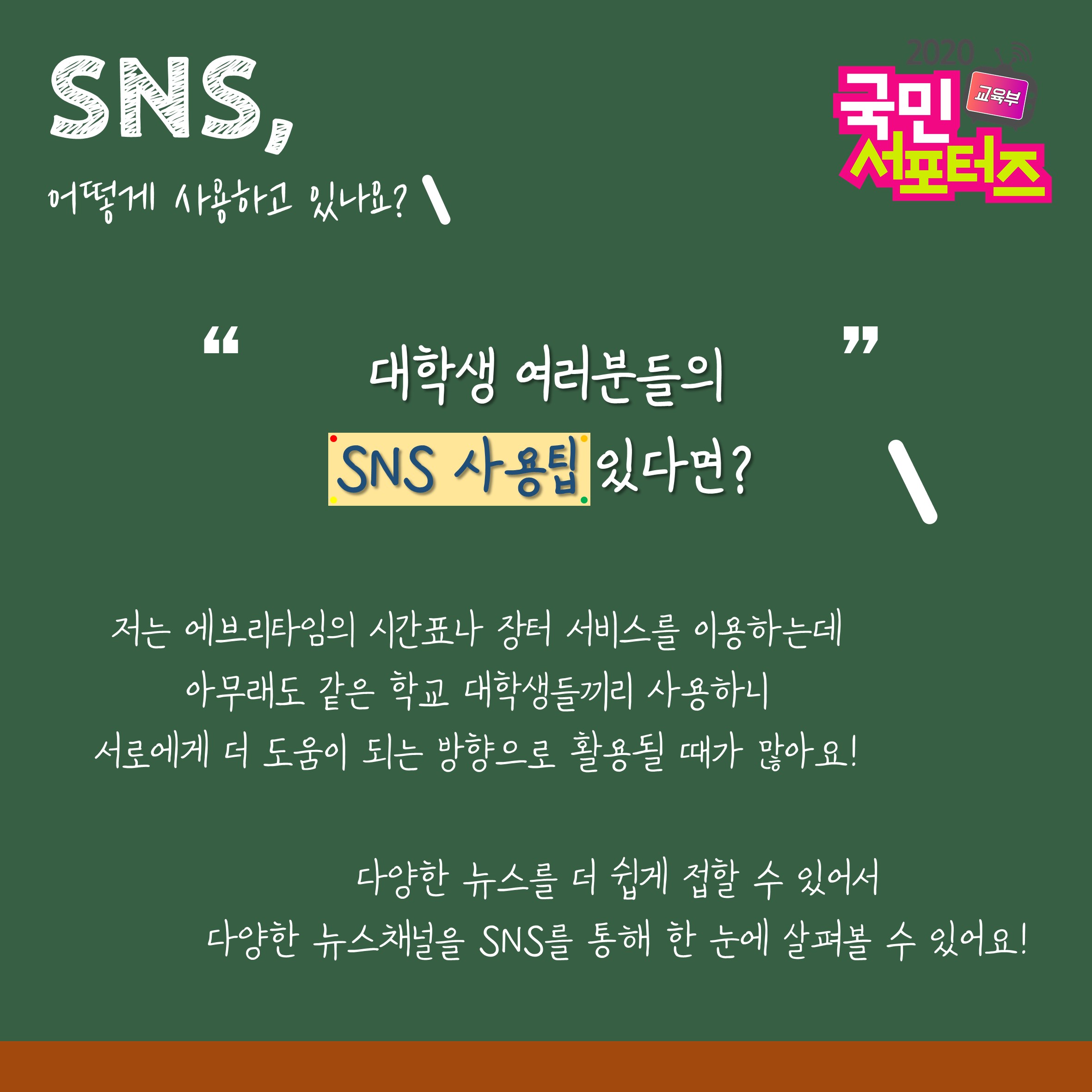 마지막으로 대학생의 경우 SNS를 통해 관심사에 대한 다양한 관점을 살펴보거나 대학생 커뮤니티를 이용하여 SNS를 활용하는 팁들을 보여주었습니다.
