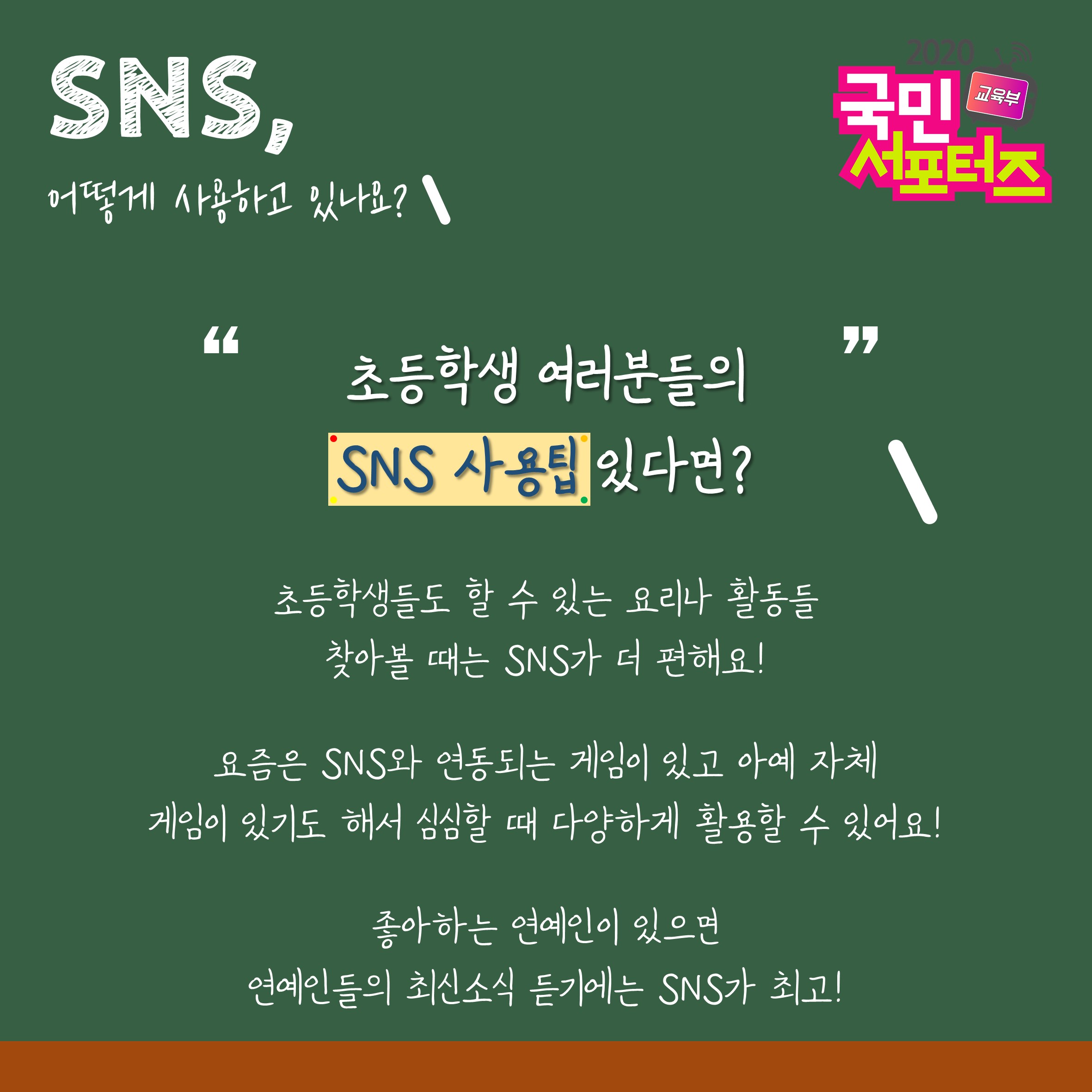 초등학생의 경우 초등학생도 할 수 있는 요리나 활동들을 SNS로 찾거나 심심할 때, 좋아하는 연예인의 소식들을 들을 때 SNS를 적극 활용하는 팁들이 있었습니다.