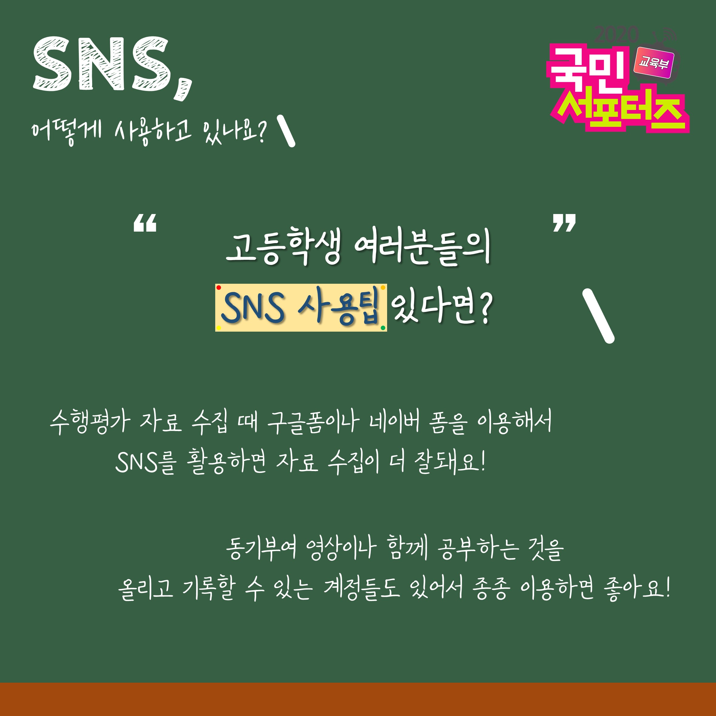 고등학생의 경우 마찬가지로 SNS의 팁 또한 학교생활, 공부와 연결되는 것을 살펴볼 수 있었습니다. 수행평가의 자료수집을 위해 SNS 플랫폼을 이용하거나 동기부여 또는 공부 의지를 위해 SNS를 건설적인 방향으로 사용하기도 하는 것을 살펴볼 수 있었습니다.