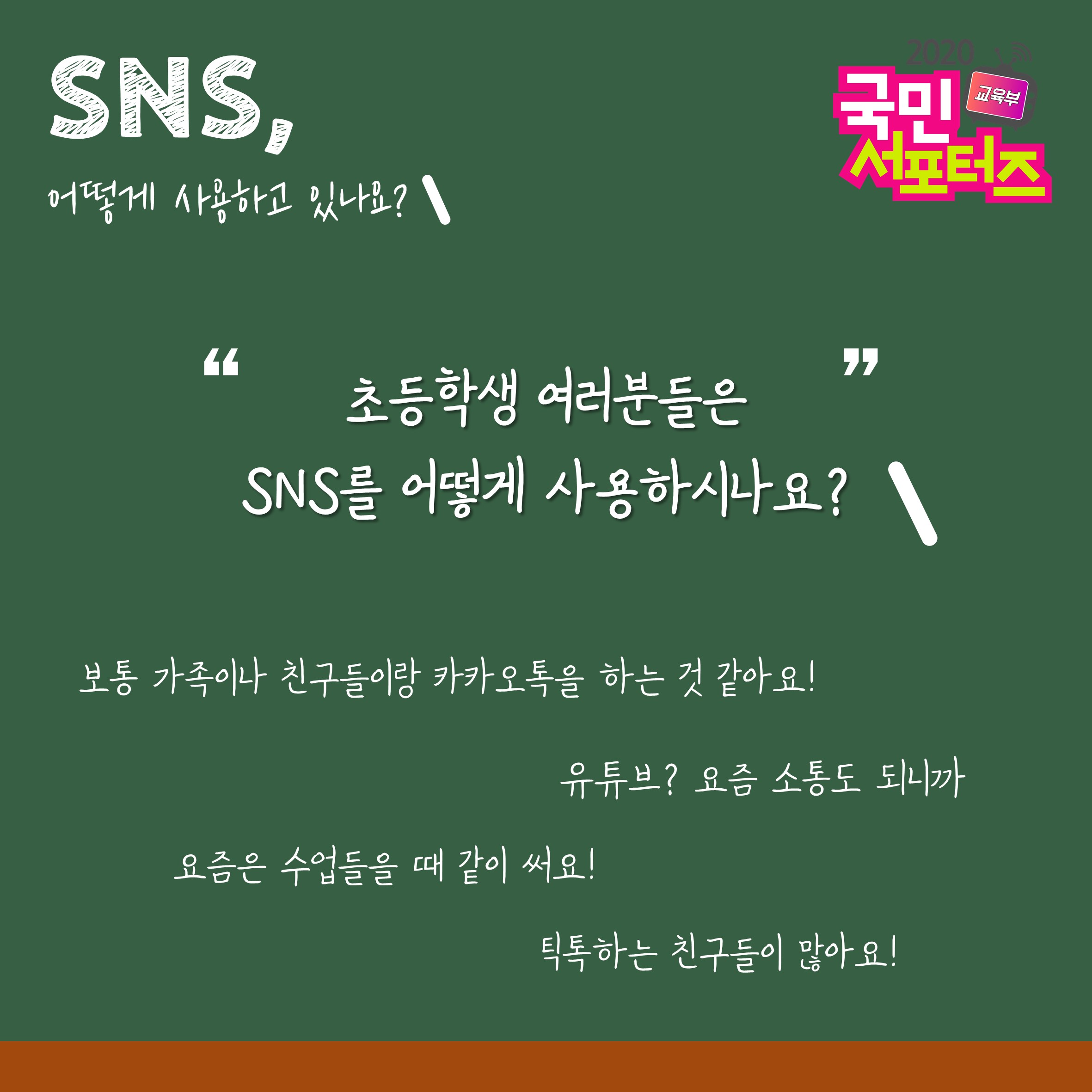 초등학생의 경우에는 보통 가족이나 친구들과 소통을 하기 위한 SNS 활동이 많다는 의견을 들을 수 있었습니다. 더불어 SNS가 단순히 소통의 용도가 아니라 심심할 때 즐길 수 있는 일종의 오락으로 사용되기도 하였습니다. 추가적으로 더 살펴볼 수 있었던 점은 학교에서 다양한 디지털 플랫폼과 기기들을 사용함에 따라 수업에서도 SNS를 활용한다는 것이었습니다. 뿐만 아니라 빠르게 등장하고 발전하는 다양한 SNS 플랫폼에 민감하고 빠르게 반응하는 세대가 현재의 초등학생들임을 살펴볼 수 있었습니다.