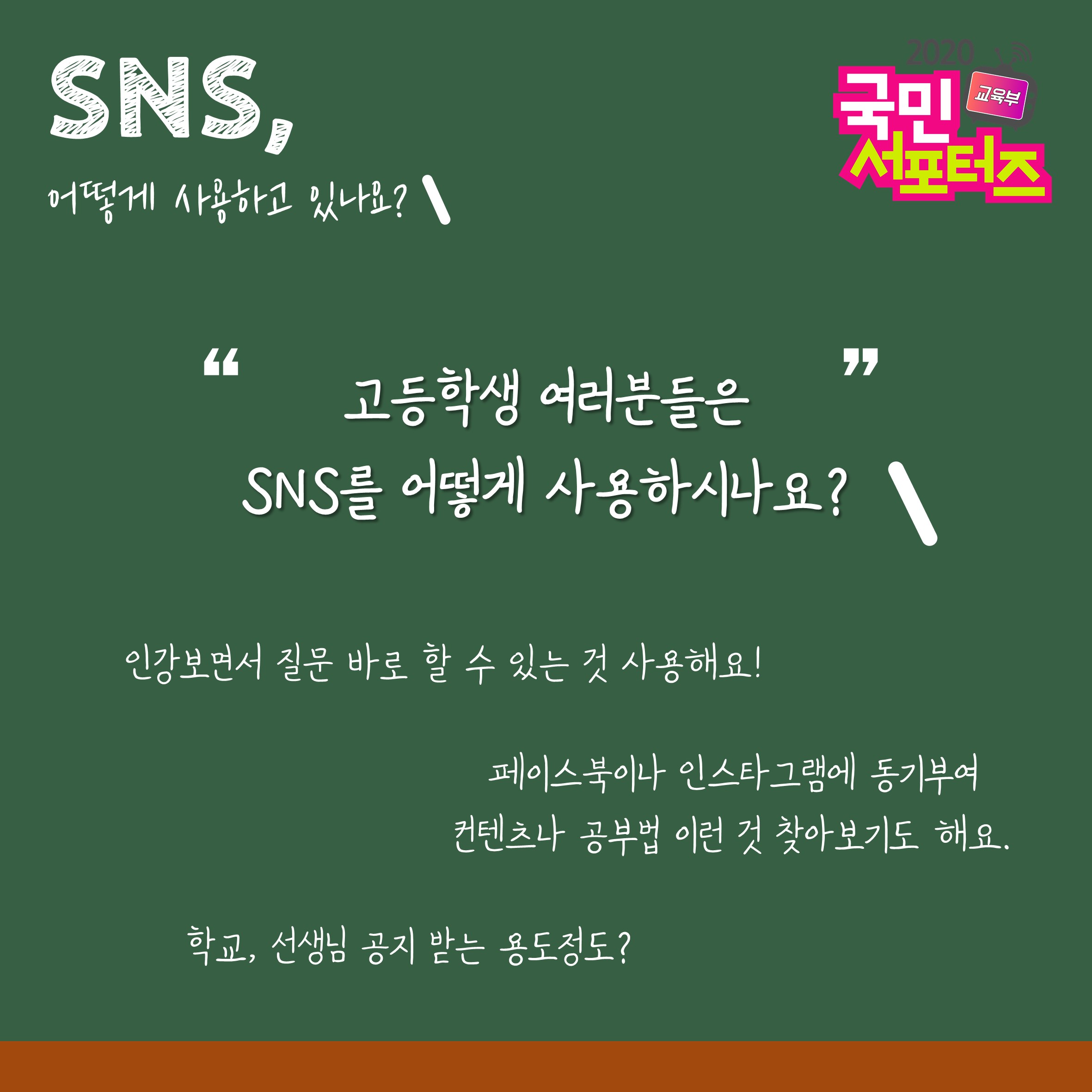 고등학생의 경우에는 인터넷 강의를 듣다가 질문을 한다거나, 공부와 관련된 정보성 콘텐츠들을 찾아보는 등 학습과 연관지어 SNS를 활용하는 경우가 많았습니다. 아무래도 고등학생들의 일상생활과 현실을 반영한 것이 아닐까요?