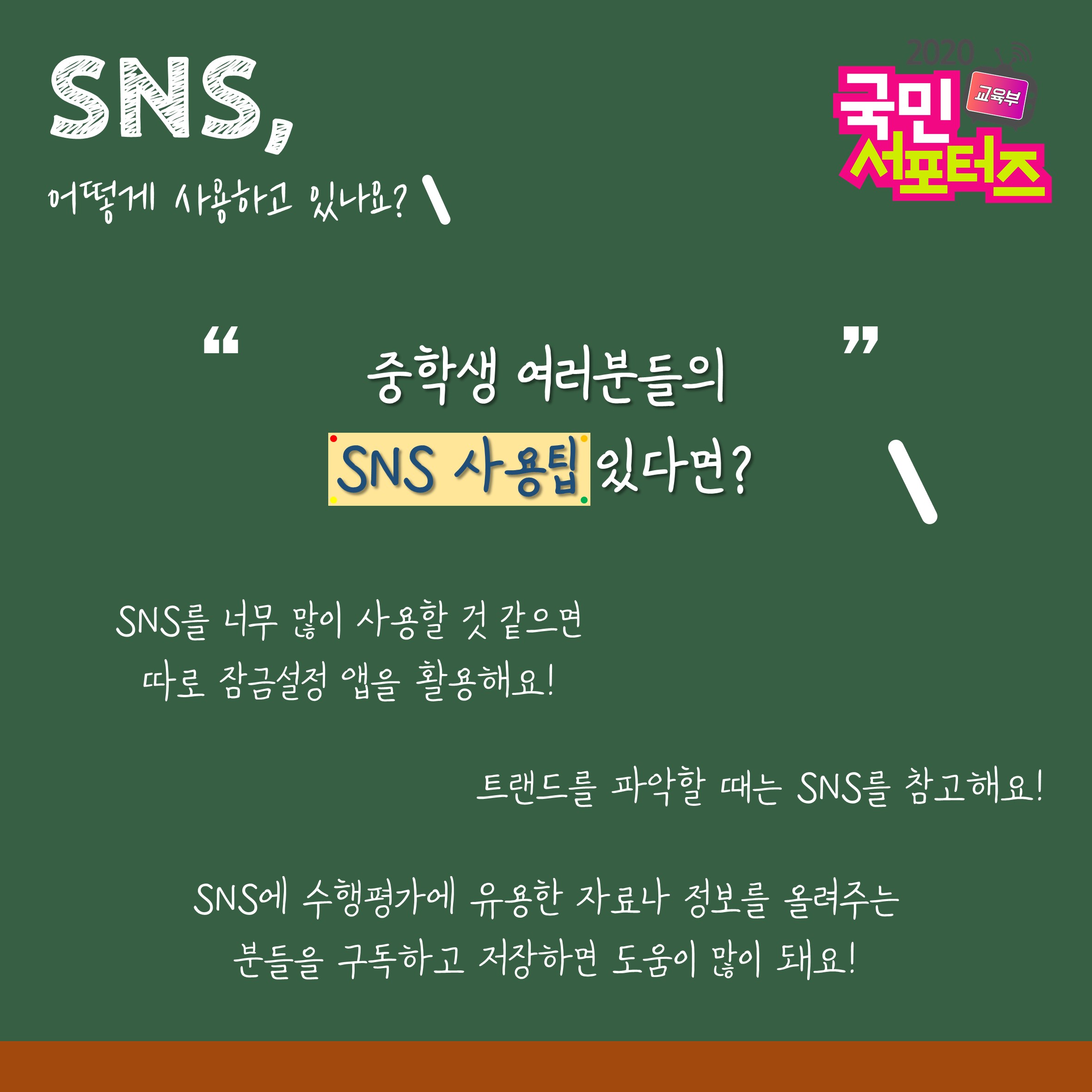 중학생의 경우에는 SNS의 활용이 지나칠 것을 경계하는 학생들도 있었으며 유행과 트랜드에 민감한 만큼 SNS를 통해 빠른 트랜드를 캐치해 내기도 했습니다. 더불어 수행평가에 있어 유용한 자료나 정보를 얻기 위해서 SNS를 활용하는 팁도 찾아볼 수 있었습니다.