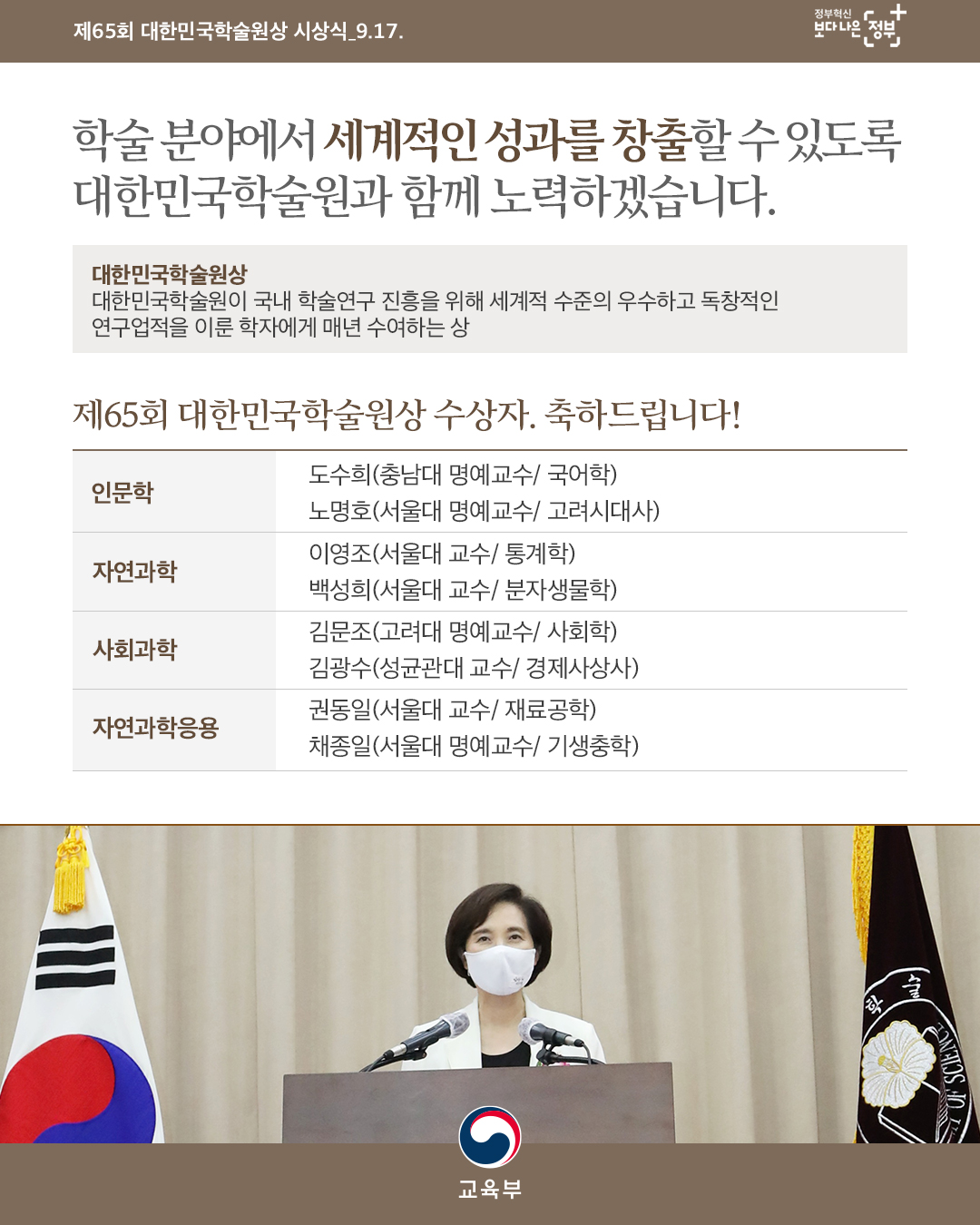 각 분야에서 연구에 정진하여 탁월한 업적을 이룬 수상자들을 축하하며, 우리나라 학문 발전과 후학양성에 있어 대한민국학술원의 역할과 지속적인 노력을 당부하였습니다.