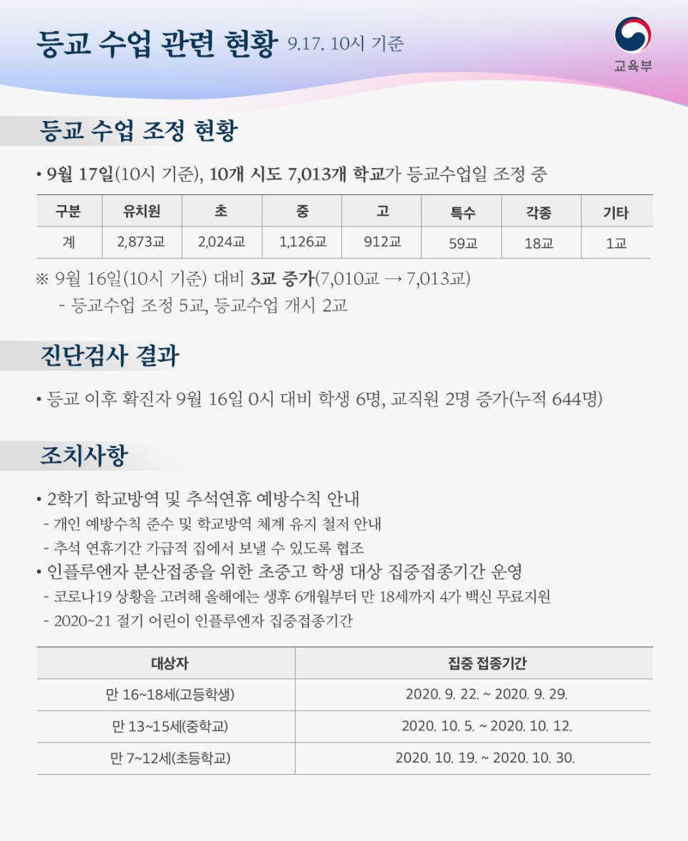 [등교수업 관련 현황 자료(9.17.) 및 인플루엔자 예방접종 안내] 본문