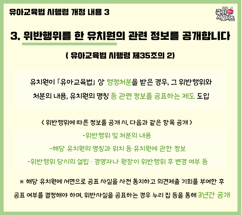 유아교육법에서 유치원이 「유아교육법」 상 행정처분을 받은 경우, 그 위반행위와 처분의 내용, 유치원의 명칭 등 관련 정보를 공표하는 제도가 도입됩니다.(법 제30조의2 신설)
