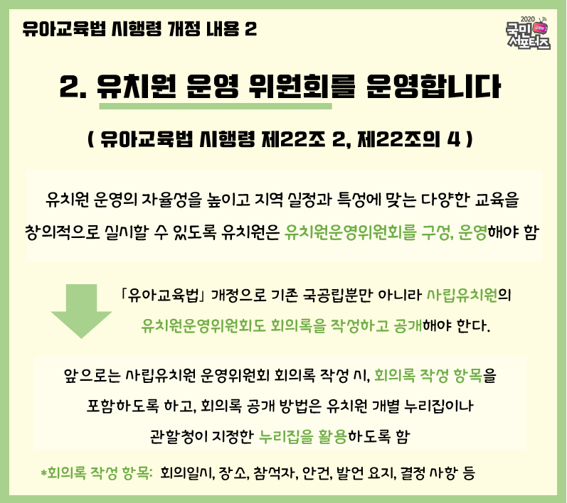 2) 유치원운영위원회 설치·운영 및 회의록 작성·공개 기준 마련( 유아교육법 시행령 제22조2, 제22조의4 )