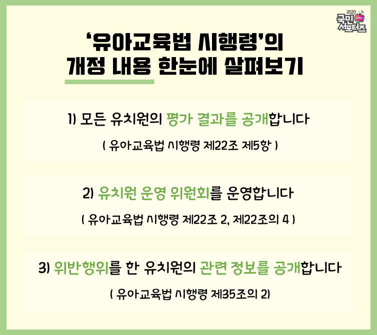 지난 1월에 개정되어 7월에 국무회의를 통과한 유아교육법 시행령! 그 핵심 내용은 다음과 같습니다.