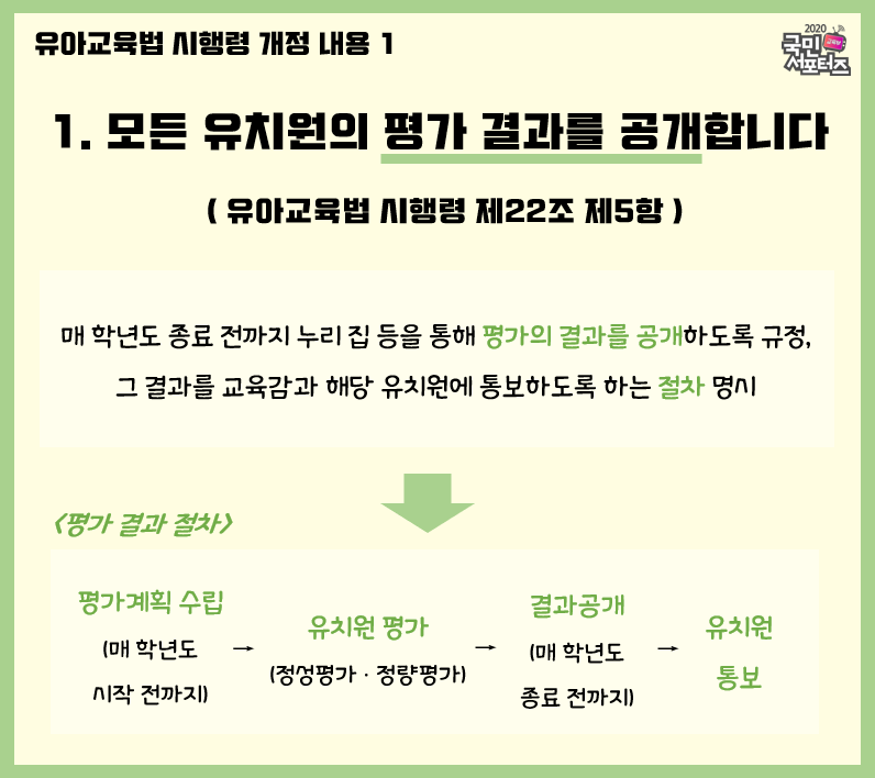 - 유치원 평가 결과의 공개 시기 및 절차 명시화 (유아교육법 시행령 제22조 제5항)