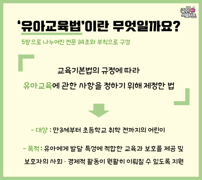유아교육법이란, 교육기본법의 규정에 따라 유아교육에 관한 사항을 정하기 위해 제정한 법입니다. 5장으로 나누어진 전문 34조와 부칙으로 구성되어 있습니다. 유아교육법은 만 3세부터 초등학교 취학 전까지의 어린이를 대상으로 발달 특성에 적합한 교육과 보호를 제공하는 동시에 보호자의 사회·경제적 활동이 원활하게 이뤄질 수 있도록 지원하는 것을 목표로 제정되었습니다.