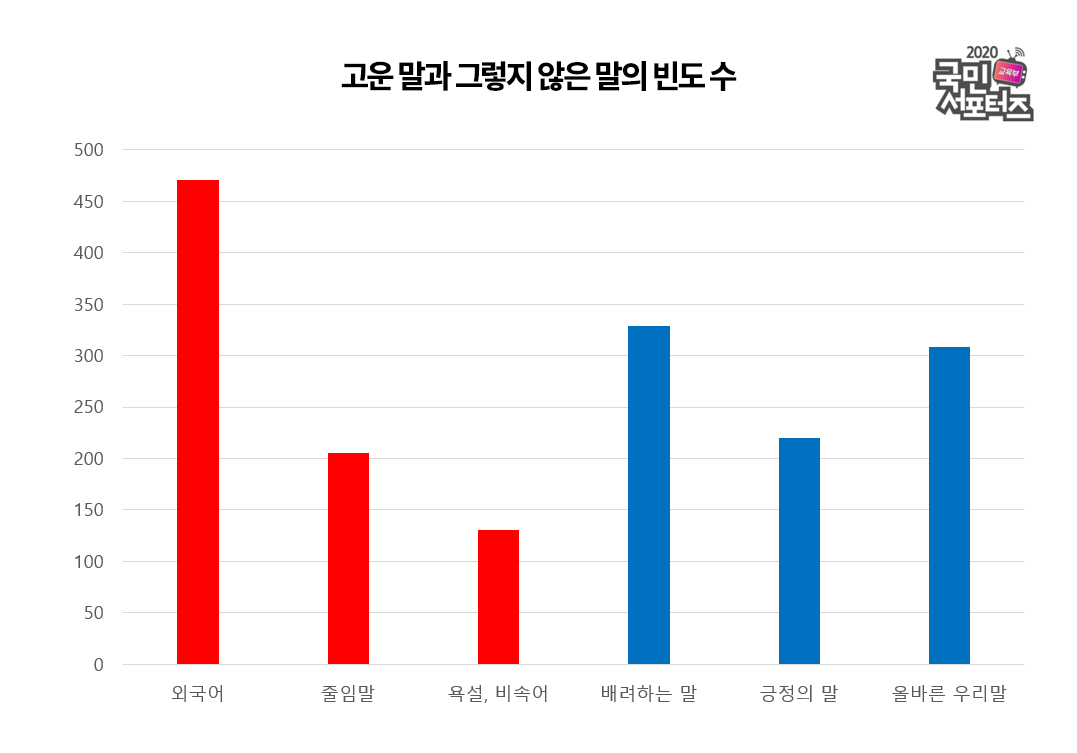 그 결과, 고운 말을 사용하는 빈도수와 사용하지 않는 빈도수가 거의 대동소이 하였습니다. 이는 즉, 고학년으로 올라갈수록 초등학생들이 일상생활에서 외국어, 욕설, 줄임말 등을 많이 사용하고 있다는 신호로 다가왔습니다. 특히 핸드폰과 컴퓨터 등을 통해 SNS나 유튜브를 많이 접하는 것도 영향을 끼치고 있는 듯 합니다.