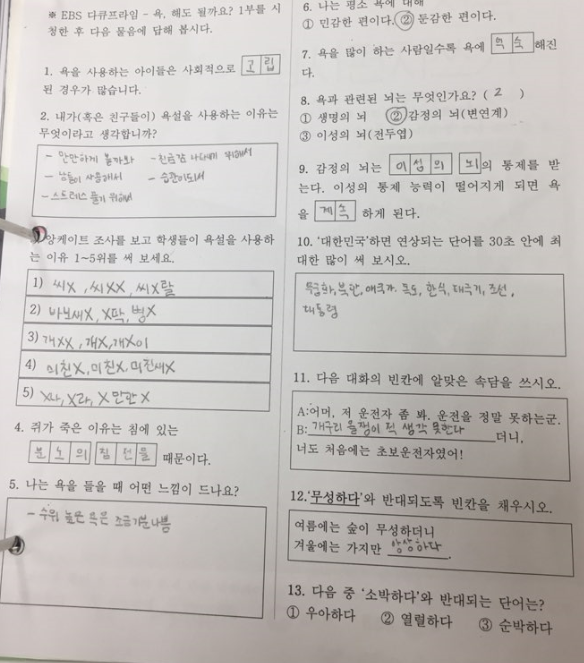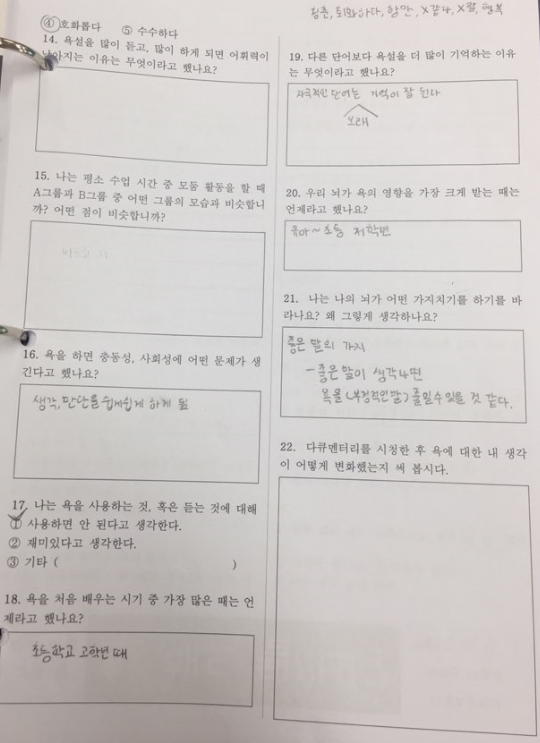EBS 다큐프라임 <욕을 사용해도 될까요?>라는 영상을 보면서 활동지를 채워 나가면서 욕에 대한 심각성과 폐해, 자신의 평소 언어생활에 대해 다시 한번 돌아보는 시간을 가졌습니다. 활동지를 채워 나가면서 욕을 사용하는 이유가 타인이 사용해서, 만만하게 볼까봐, 친근감을 나타내기 위해서, 습관이 돼서, 스트레스를 풀기 위해서 등 다양한 이유가 존재했습니다. 이로 인해 욕이 뇌에 영향을 많이 미쳐 이성의 통제 능력이 떨어지게 되면 욕을 많이 하게 된다는 점을 새롭게 알게 되었습니다. 특히 영상에서 욕을 많이 사용하는 아이들에게 부정적인 영향이 많이 발생했는데, 예를 들면 인내심과 계획성이 부족하고, 자기 제어 능력과 어휘력이 떨어지며 더 나아가 우울증에 걸리거나 마음이 불행해지는 모습을 볼 수 있었습니다. 한편으로, 아름다운 말과 예쁜 노래를 부른다면 즐거운 마음이 생기고, 세상이 아름답게 보이는 등 친구들과 내 자신도 행복해져 아름다운 세상을 만들어갈 수 있다는 말에 공감이 되었습니다.