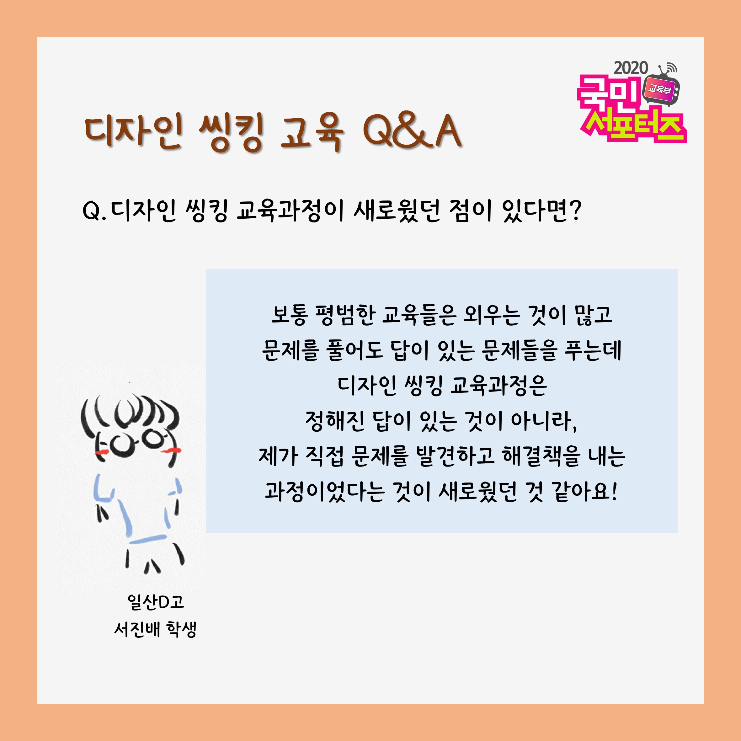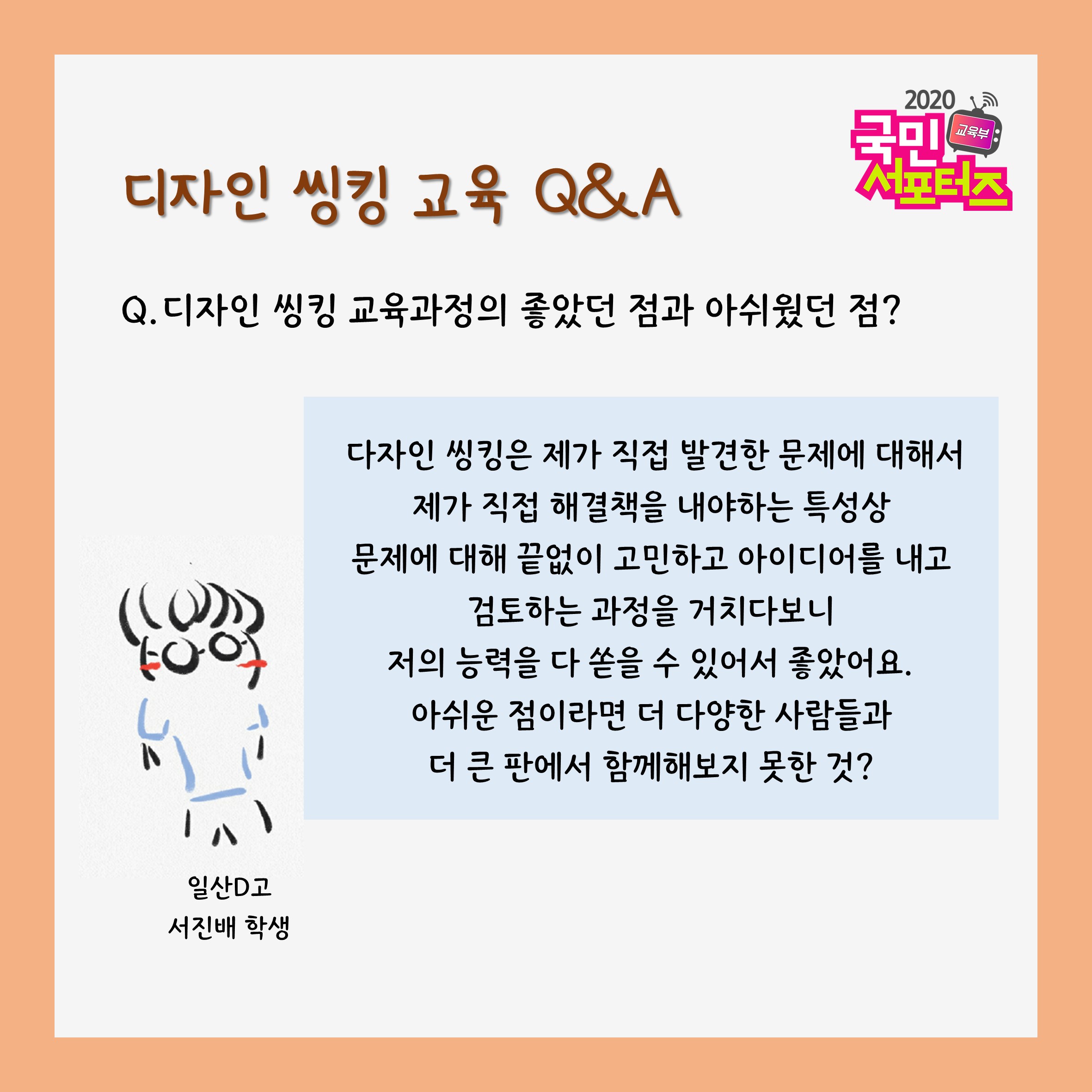 보통 평범한 교육들은 외우는 것이 많고 문제를 풀어도 답이 있는 문제들을 푸는데 디자인 씽킹 교육은 정해진 답이 있는 것이 아니라, 제가 직접 문제를 발견하고 해결책을 내는 과정이었다는 것이 새로웠던 것 같아요. 그리고 디자인 씽킹은 제가 직접 발견한 문제에 대해서 제가 직접 해결책을 내야 하는 특성상 문제에 대해 끊임없이 고민하고 아이디어를 내고 검토하는 과정을 거치다보니 저의 능력을 다 쏟을 수 있어서 좋았어요. 아쉬운 점이라면 더 다양한 사람들과 더 큰 판에서 함께해보지 못한 것이 아쉽네요.