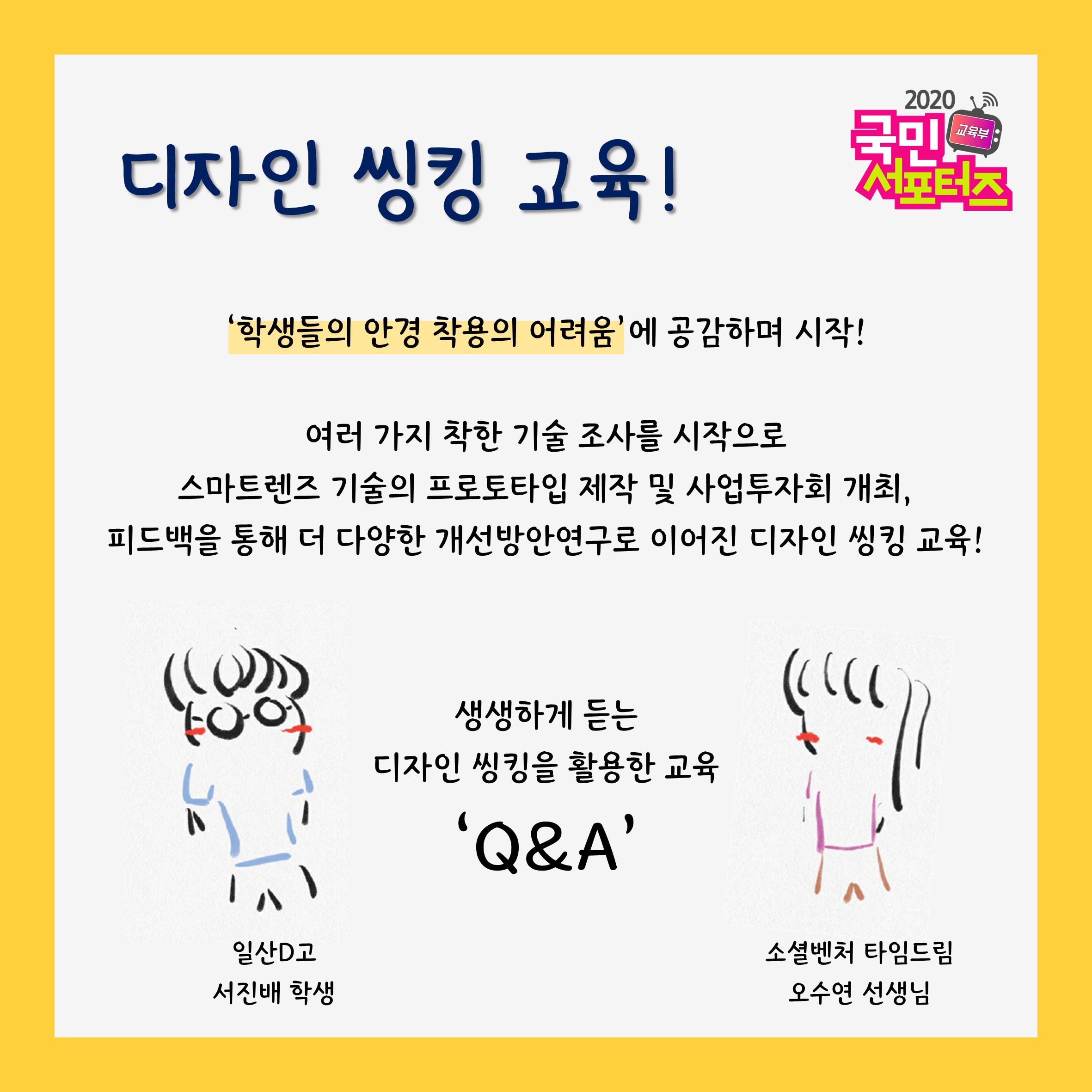 소셜벤처 타임드림에서 진행된 디자인 씽킹 교육에 참여한 학생과 선생님을 모셨습니다. 이들은 학생들의 안경 착용에 대한 어려움으로 시작해 직접 여러 가지 착한 기술을 조사하고 사업 투자회까지 개최하며 아이디어를 발전시켜나가고 있는데요. 그들이 이야기하는 디자인 씽킹에 대하여 살펴볼까요?