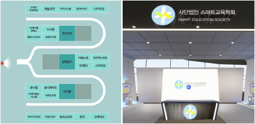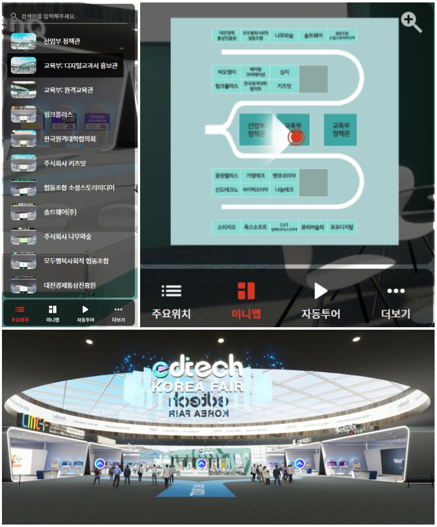 가상전시관에 들어가면 실제 박람회에서 볼 수 있는 것처럼 구성되어 있습니다. 메뉴에서 “주요위치”를 누르면 부스 목록이 나타나 자신이 원하는 부스를 볼 수 있고, “미니맵”으로 전체적인 부스 배치도 알 수 있습니다. “자동투어”를 통해 가벼운 마음으로 둘러보다가 관심 있는 부스에서 자세하게 볼 수 있도록 했습니다. 실제 사람들의 자연스러운 모습과 바닥 화살표, 부스마다 특징 있는 모습 등은 실제의 모습을 그대로 구현해서 온라인으로도 충분히 생동감을 느낄 수 있도록 했습니다.