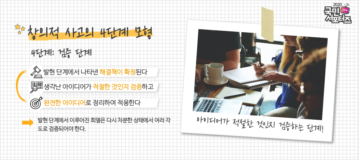 발현 단계에서 나타난 해결책은 검증 단계를 거쳐 확정됩니다. 검증단계에서는 3단계에서 생각해낸 아이디어가 적절한 것인지를 검증하고, 그것이 적절한 것으로 판정되면 완전한 아이디어로 정리하여 적용하게 됩니다. 적용하는 과정에서 그 아이디어는 계속 검토·발전됩니다. 창의적 아이디어를 떠올리며 이루어진 희열은 차분한 상태에서 여러 각도로 검증되어야 하는 것이죠.