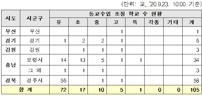 ㅇ 9.23.(10시 기준) 5개 시·도 105개 학교가 등교 수업일 조정 중