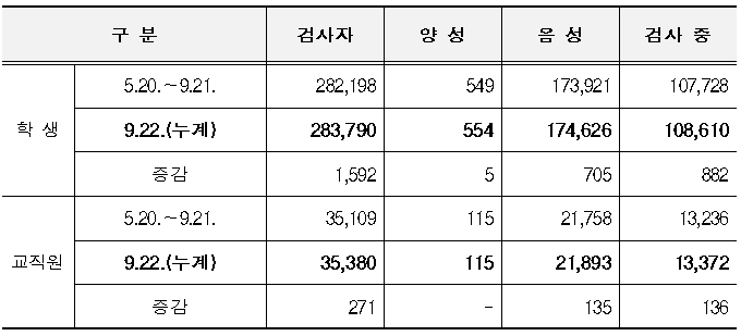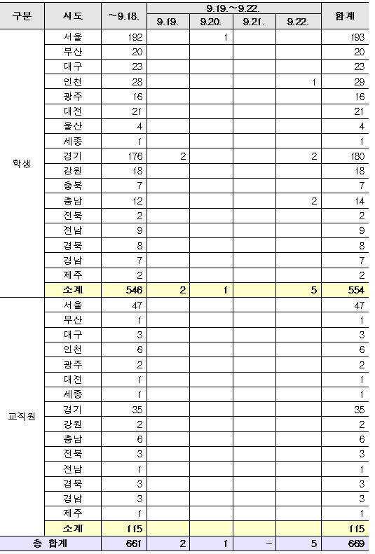 - 등교 이후 확진자 누계 9.22.(화) 00시 대비 학생 5명 증가【누계 669명(학생 554명, 교직원 115명)】