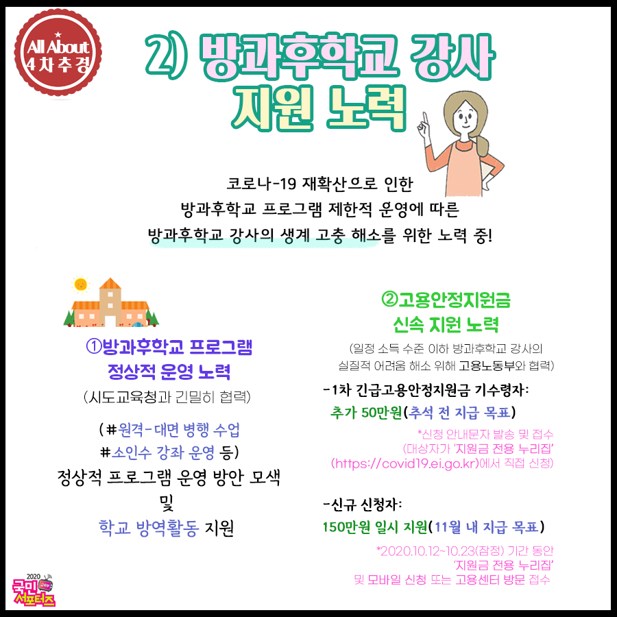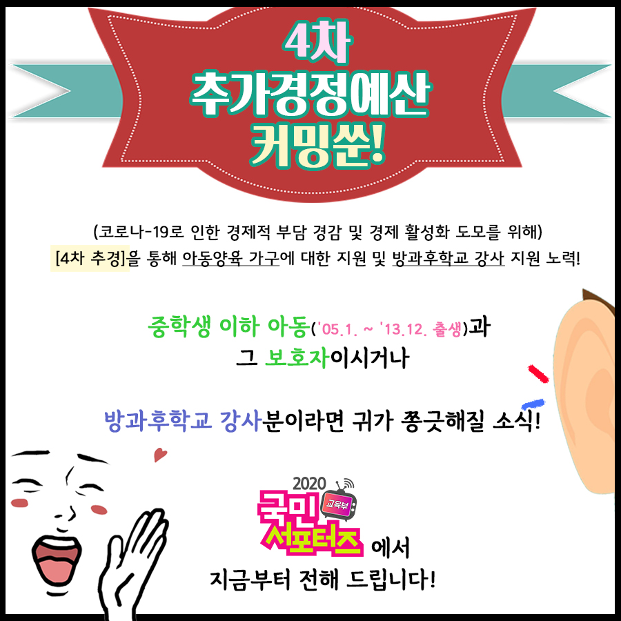 코로나19를 위한 국민들의 어려움 해소를 위해 이번에 정부에서 4차 추경을 계획했습니다. 오늘은 그 중 아동 양육 가구의 돌봄 및 원격 수업으로 인한 경제적 부담 경감과 제한적 방과후학교 운영에 따른 방과후학교 강사의 경제적 부담 해소 두 가지에 대해 알아보도록 하겠습니다.