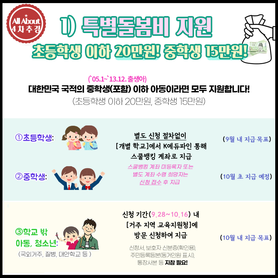 대한민국 국적 중학생 이하(포함) 아동(’20.9월 기준, `05.1.∼’13.12. 출생아)을 대상으로 초등학생 연령 이하 아동 1인당 현금 20만 원, 중학생 연령 아동 1인당 15만원이 계좌로 지급됩니다!
