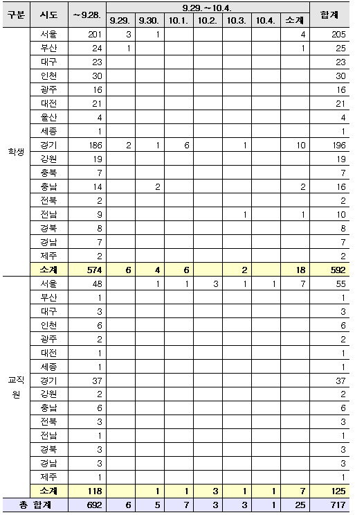 - 등교 이후 확진자 누계 9.29.(화) 00시 대비 학생 18명, 교직원 7명 증가 【누계 717명(학생 592명, 교직원 125명)】
