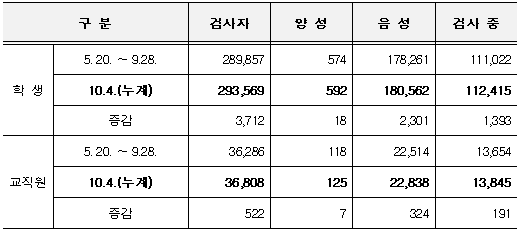 □ 등교 이후 진단검사 현황(10.5. 0시 기준)