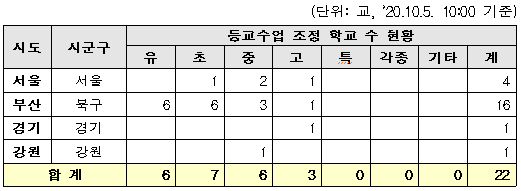 ㅇ 10.5.(10시 기준) 4개 시·도 22개 학교가 등교 수업일 조정 중