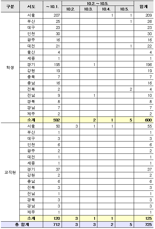 - 등교 이후 확진자 누계 10.5.(월) 00시 대비 학생 8명 증가 【누계 725명(학생 600명, 교직원 125명)】