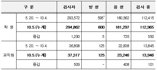 - 10.5.(10시 기준)22교에서 1교 증가(3교 등교수업 조정, 2교 등교수업 개시)