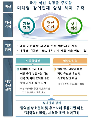 미래 사회 변화에 대응하여 대학 기본역량 강화 및 전략적 특성화를 지원하고 대학의 자율 혁신을 통해 국가 혁신 성장의 토대가 되는 미래형 창의 인재 양성 체제 구축 지원을 목적으로 합니다.